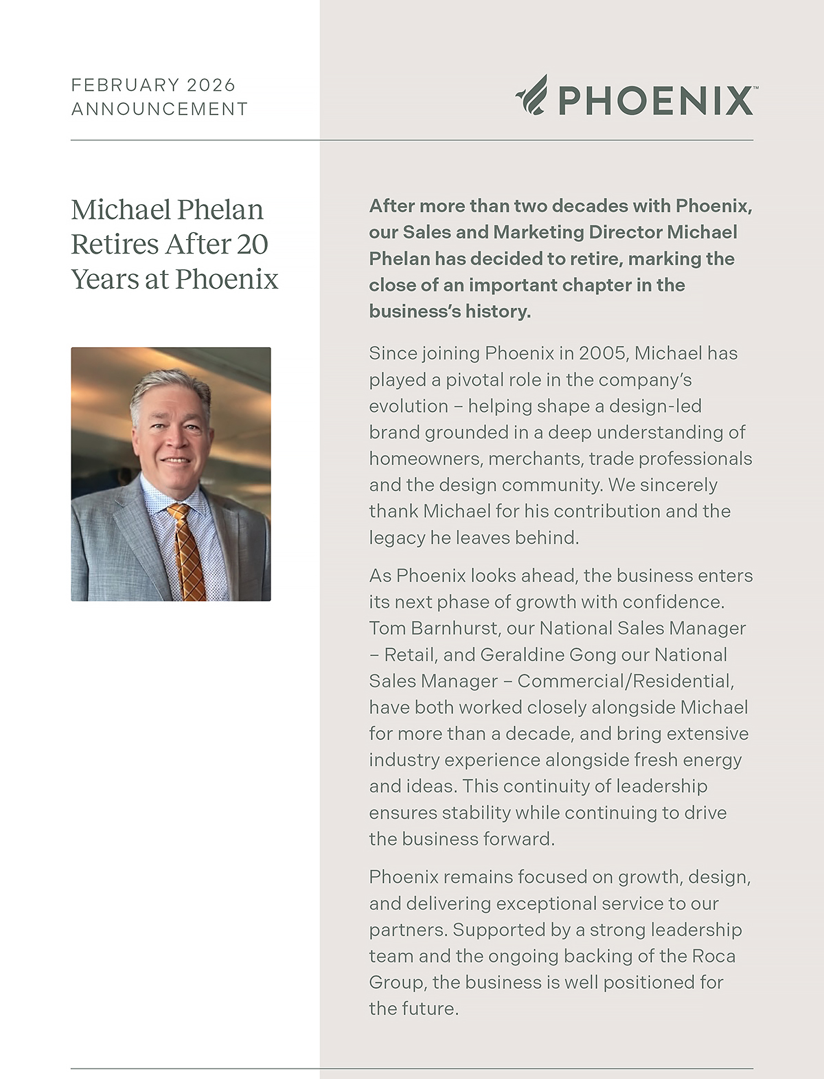 After more than two decades with Phoenix, our Sales and Marketing Director Michael Phelan has decided to retire, marking the close of an important chapter in the business’s history.