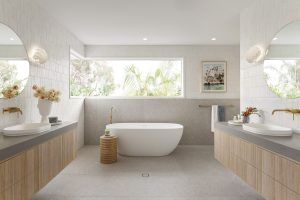 The Coral Homes Bentley 38 Bathroom, featuring Phoenix Vivid Slimline tapware, shower and accessories, in Brushed Gold